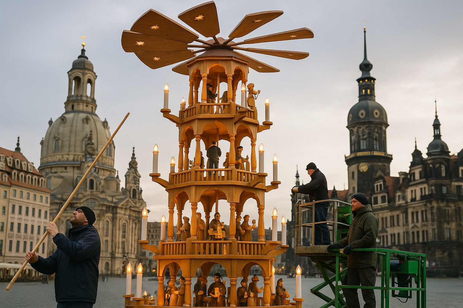 🎄 Auf dem Dresdner Altmarkt wird derzeit eine mehrstöckige Weihnachtspyramide aus dem Erzgebirge montiert. Das hölzerne Bauwerk trägt an der Spitze einen goldenen Stern; auf den Ebenen finden Figuren von Engeln und Musikanten Platz. Mit dem charakteristischen Drehen ist erst gegen Ende November zu rechnen. Die zugrundeliegende Agenturmeldung datiert vom 3. November 2025.