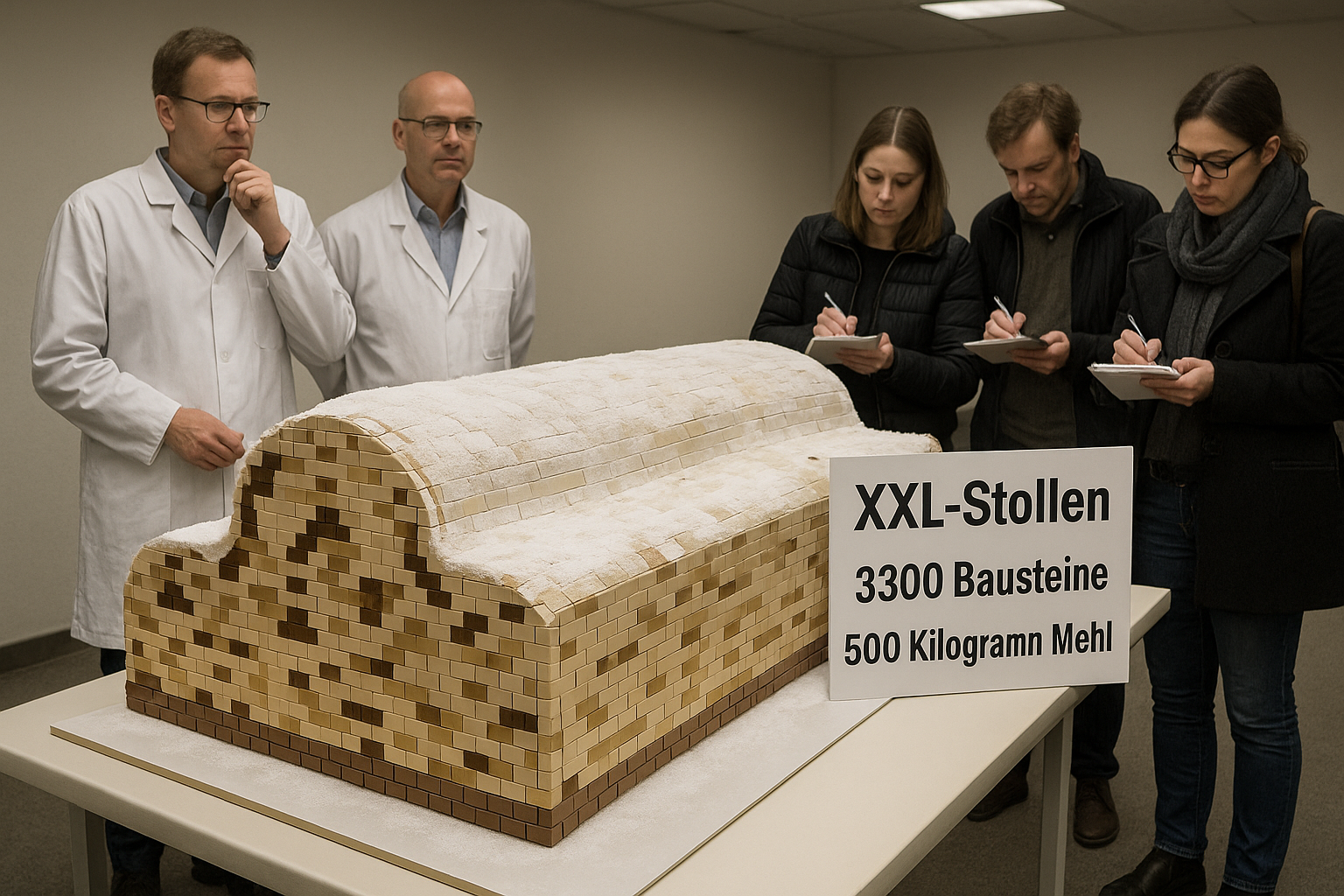 đ ïž Herstellung im Detail Die Grundlage des Giganten entstand aus rund 275 Stollenplatten, jeweils 60 mal 40 Zentimeter groĂ und etwa sieben Kilogramm schwer. Eine Maschine zerlegte die Platten in rund 3300 Bausteine, die anschlieĂend passgenau zusammengesetzt wurden. 35 BĂ€ckerinnen und BĂ€cker sowie zahlreiche Helfer arbeiteten dafĂŒr rund sieben Stunden.