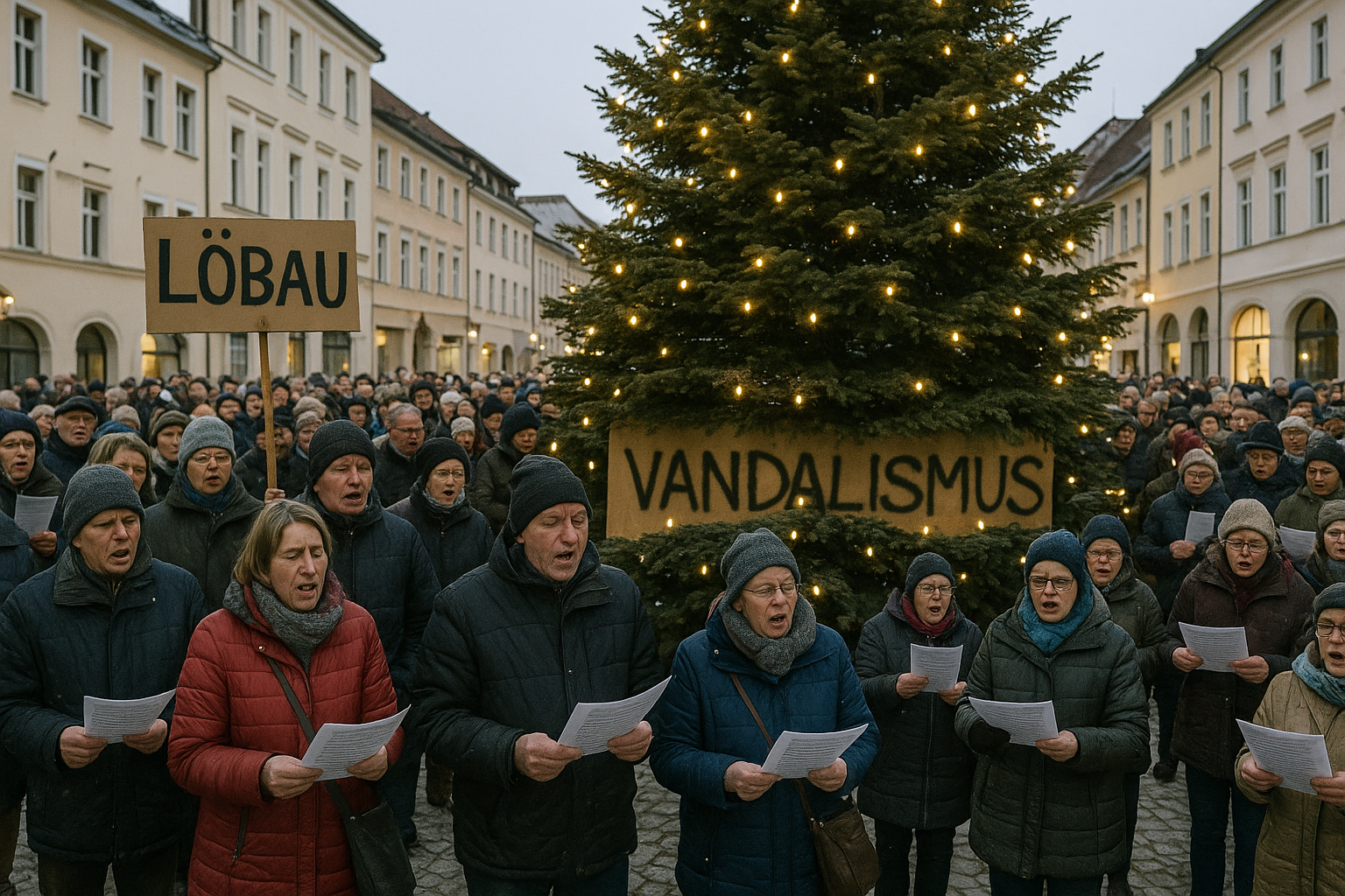 🎄 Überblick Am 21. Dezember 2025 haben sich auf dem Altmarkt in Löbau mehr als 850 Menschen versammelt, um Weihnachtslieder anzustimmen. Der Anlass war unerfreulich: Die Bürgerschaft reagierte geschlossen auf einen mutwilligen Angriff auf den städtischen Weihnachtsschmuck. Das Bild war ein besonnener Protest im besten Sinne – friedlich, würdevoll, klar in der Botschaft.