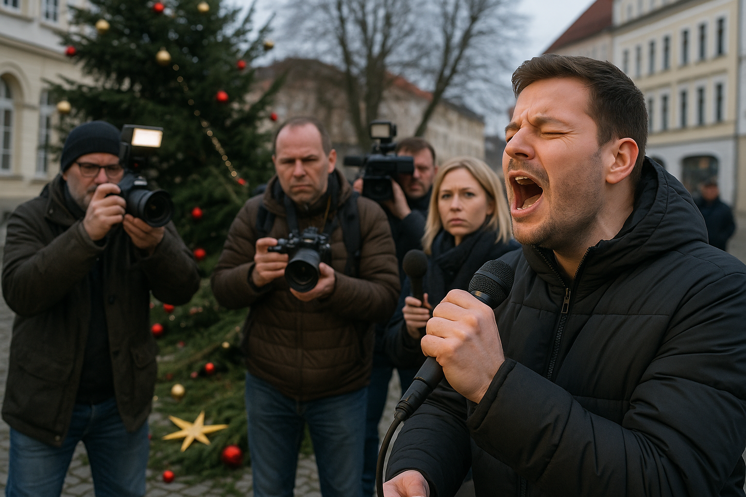 🎶 Ablauf der Singaktion Die Veranstaltung war bewusst einfach gehalten und gerade dadurch wirkungsvoll. Am Klavier begleitete Kirchenmusikdirektor Christian Kühne den spontan zusammengefundenen Bürgerchor. Mitglieder der Freiwilligen Feuerwehr verkauften Kuchen und Glühwein, der Erlös fließt in neue Herrnhuter Sterne für den künftigen Weihnachtsbaum. Vertreter der Werbegemeinschaft berichteten von einer unerwartet großen Beteiligung und einem klaren Signal gegen Resignation.