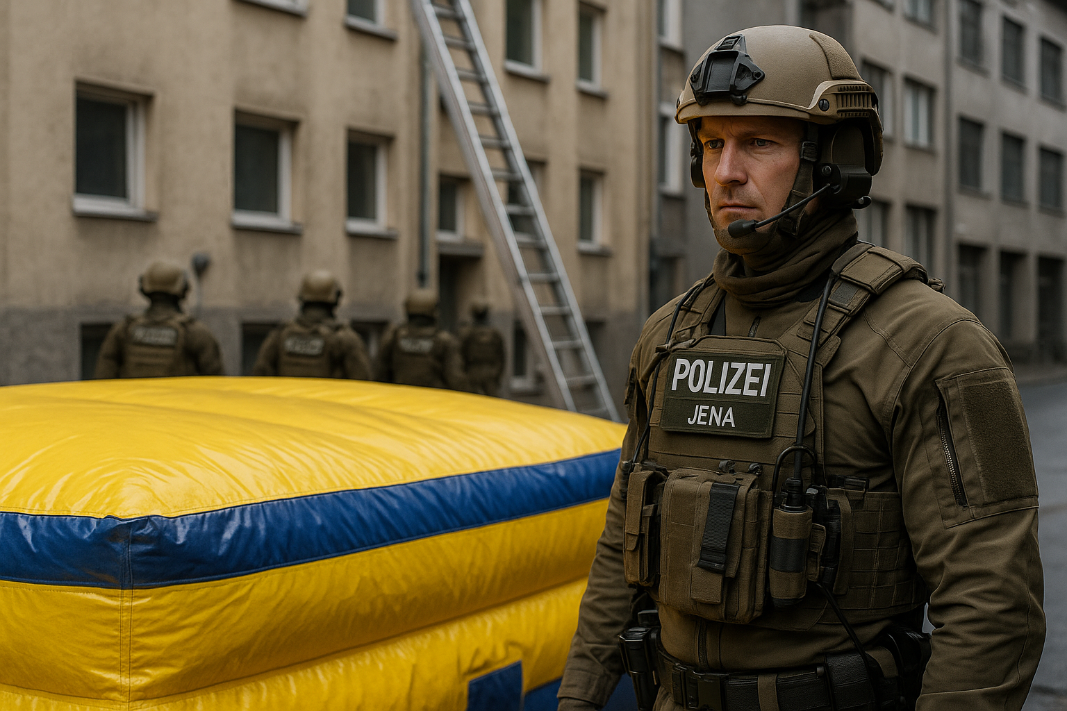 🚓 Ablauf des Einsatzes Die Einsatzkräfte sperrten das Umfeld weiträumig ab und zogen neben der Polizei auch die Berufsfeuerwehr Jena sowie Rettungsdienste hinzu. Unterhalb des Balkons wurde vorsorglich ein Sprungkissen positioniert. Gegen 09:45 Uhr sprang der Mann über die Balkonbrüstung und landete auf dem Rettungsmittel, ehe er medizinisch versorgt und in ein Krankenhaus verbracht wurde.