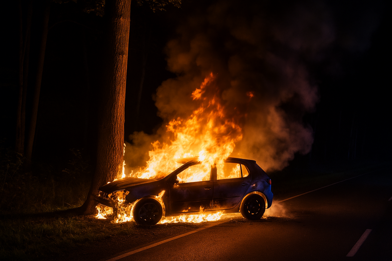 💥 Ablauf des Geschehens Nach bisherigen Erkenntnissen verlor der junge Mann in den Nachtstunden die Kontrolle über seinen Wagen, verließ die Straße und kollidierte mit einem Baum. Durch den heftigen Aufprall überschlug sich das Fahrzeug und fing Feuer.